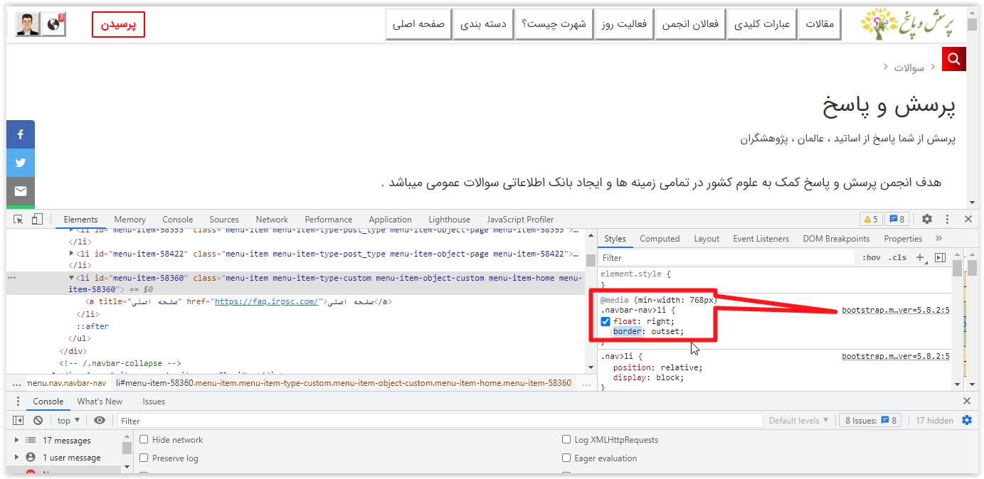 5-در صورت وجود border میتوانید آن را تغییر دهید با تغییر حالت نوشته شده در تصویر outset و یا اگر نیاز به اضافه کردن border دارید میتوانید مت border را در همون کادر بنویسید و اینتر را بزنید تا برای انتخاب حالت گزینه ها نمایش داده شود .