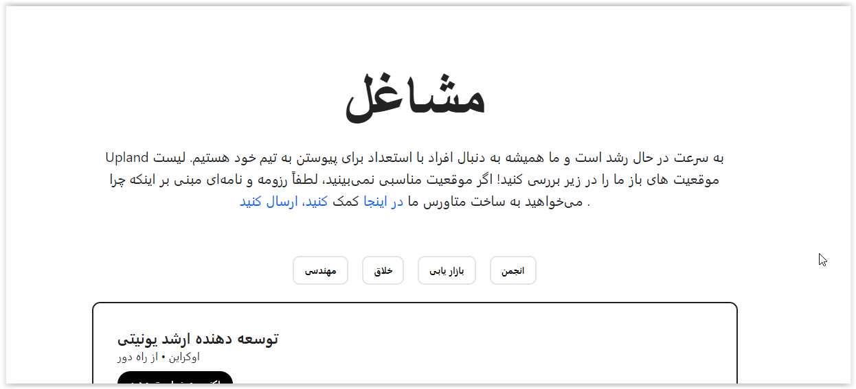متاورس آپلند Upland به سرعت در حال رشد است و ما همیشه به دنبال افراد با استعداد برای پیوستن به تیم خود هستیم. لیست موقعیت های باز ما را در زیر بررسی کنید! اگر موقعیت مناسبی نمیبینید، لطفاً رزومه و نامهای مبنی بر اینکه چرا میخواهید به ساخت متاورس آپلند میتوانید با ایمیلی که در انتها بارگذاری شده است پیام و رزومه خود را ارسال نمایید . سوالی در خصوص نحوه ارسال رزومه داشتید در همینجا مطرح کنید . پشتیبان شما انجمن متاورس ایران . توسعه دهنده ارشد یونیتی اوکراین • از راه دور برسی دقیق تر کلیک کنید . مدیر جامعه سانفرانسیسکو، کالیفرنیا برسی دقیق تر کلیک کنید . مدیر محتوا LiveOps لاس وگاس، NV بررسی دقیق تر کلیک کنید . طراح ارشد UI/UX اوکراین بررسی دقیق تر کلیک کنید . طراح بصری اوکراین بررسی دقیق تر کلیک کنید . طراح UI/UX اوکراین بررسی دقیق تر کلیک کنید . رئيس ستاد پالو آلتو، کالیفرنیا بررسی دقیق تر کلیک کنید . توسعه دهنده React.js اوکراین • از راه دور بررسی دقیق تر کلیک کنید . توسعه دهنده Node.js اوکراین • از راه دور بررسی دقیق تر کلیک کنید . کارشناس بازاریابی رشد ایالات متحده آمریکا • از راه دور بررسی دقیق تر کلیک کنید . طراح UI/UX ایالات متحده آمریکا • از راه دور بررسی دقیق تر کلیک کنید .