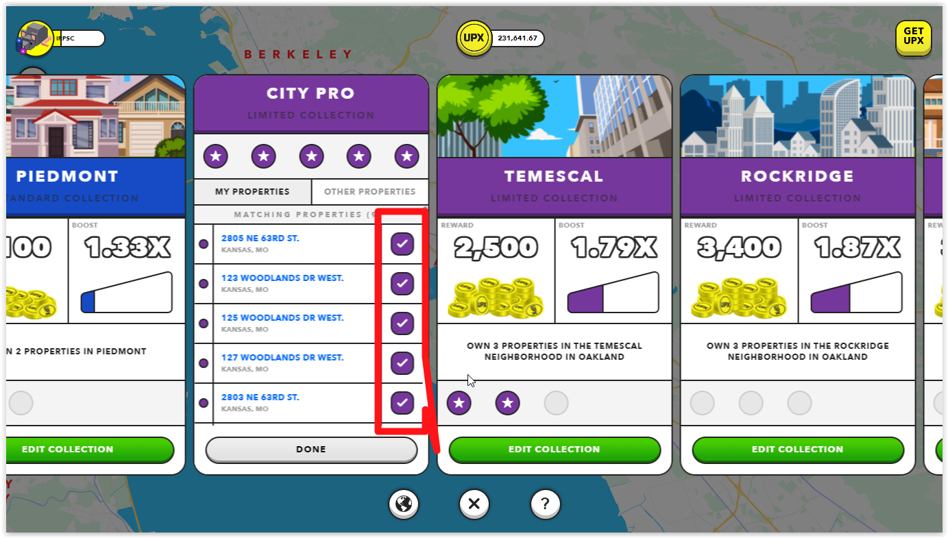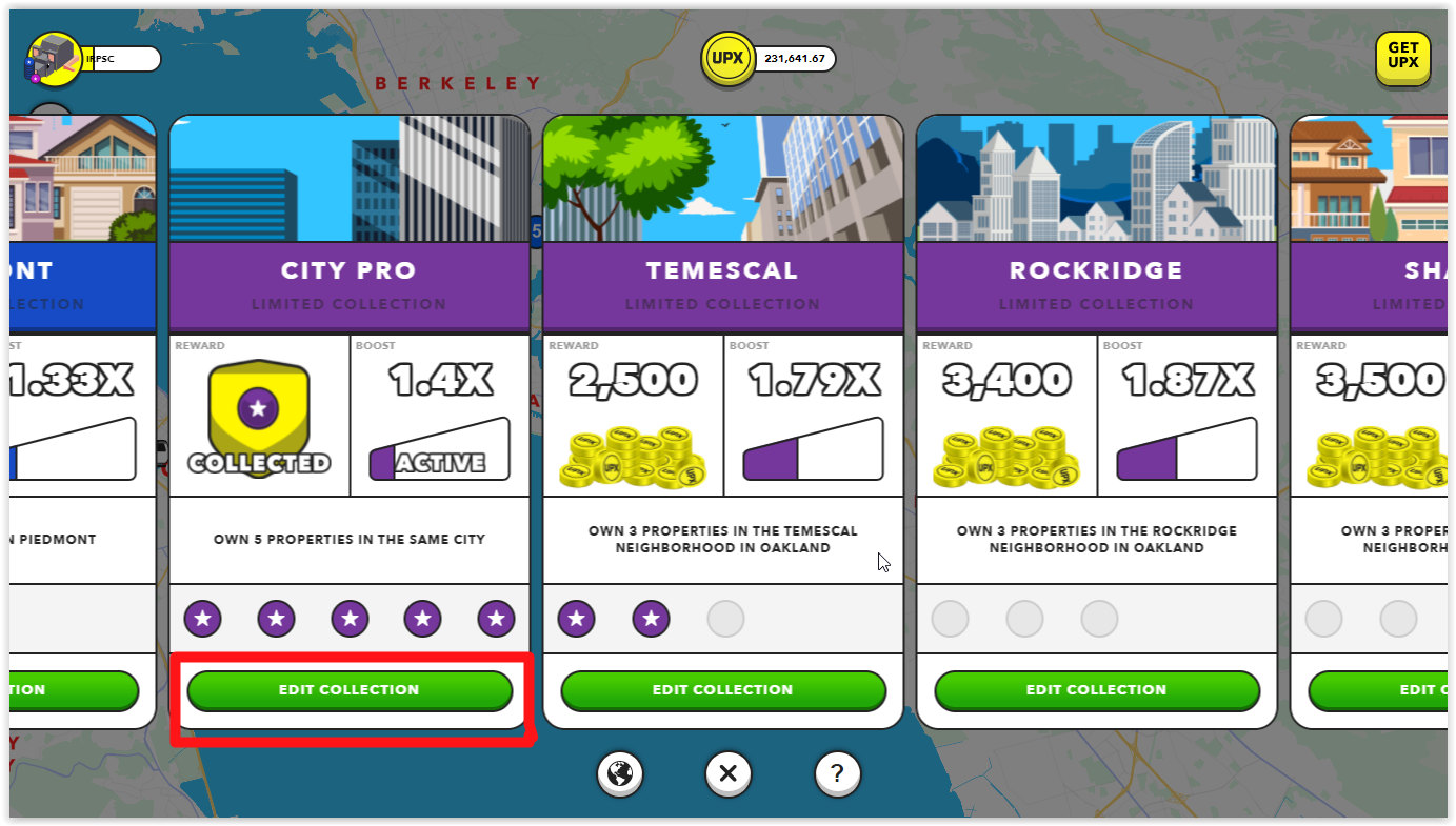 - City Pro - دارای 5 ملک در همان شهر است. شما یک جایزه 1200 UPX و یک افزایش 1.4 برابری دریافت می کنید.